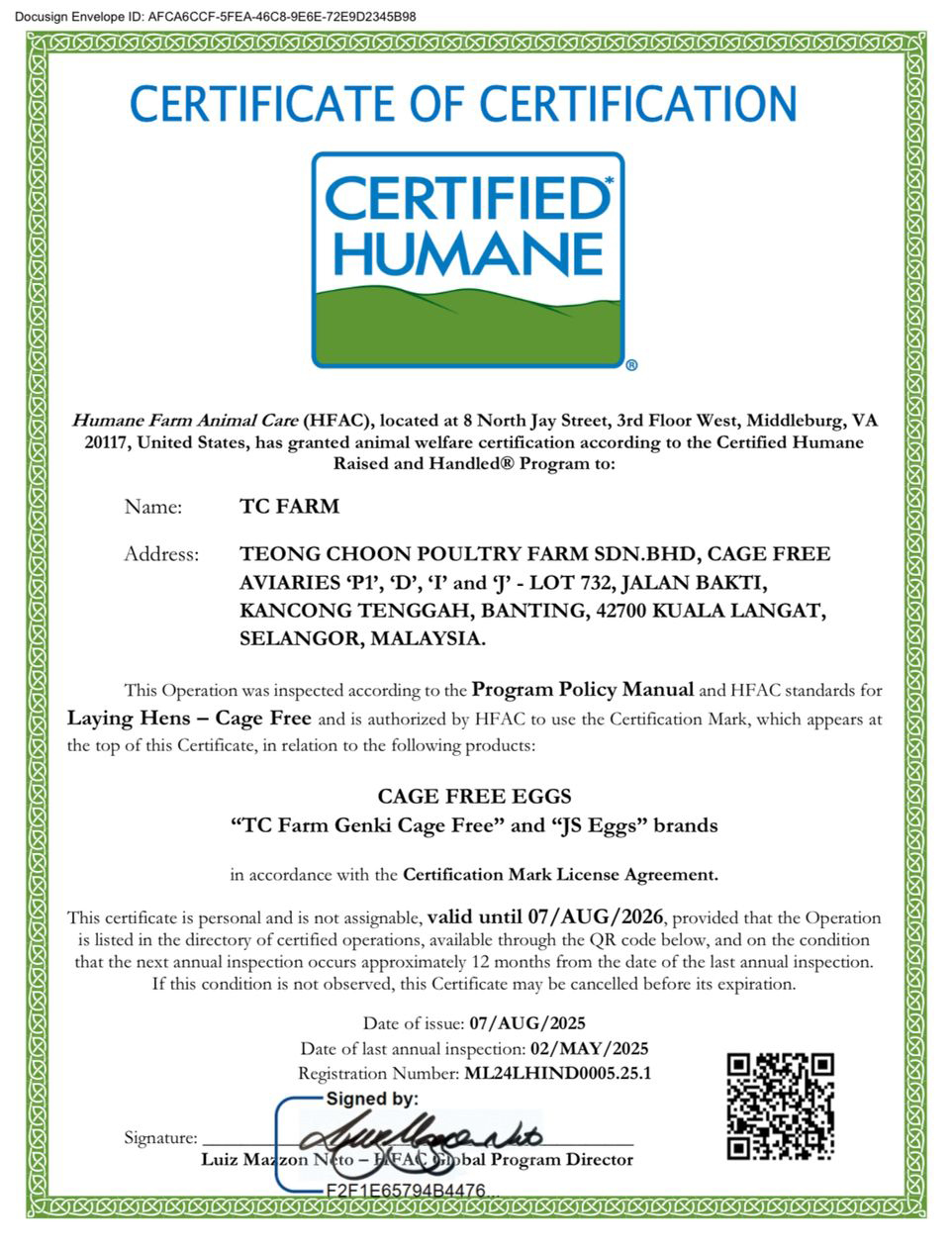 The Certified Humane® label is among the world’s most respected animal welfare certifications, requiring annual independent audits and strict compliance with science-based welfare criteria. TC Poultry’s reinstatement underscores the resilience of Malaysia’s cage-free sector and its readiness to uphold the nation’s growing reputation as Southeast Asia’s hub for humane-certified egg production.